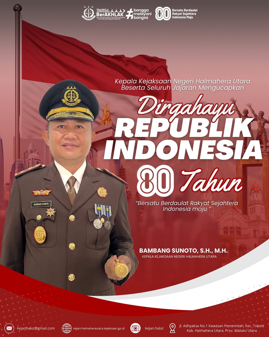 Kepala Kejaksaan Negeri Halmahera UtaraBambang Sunoto, S.H., M.H.Beserta seluruh jajaran mengucapkan Dirgahayu Republik IndonesiaKe-80 Tahun 2025 “Bersatu Berdaulat Rakyat Sejahtera…