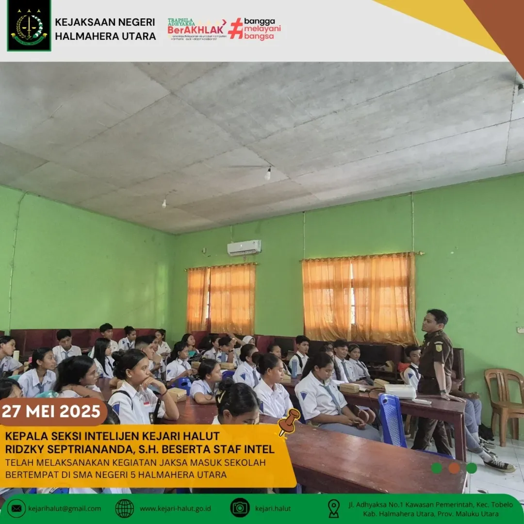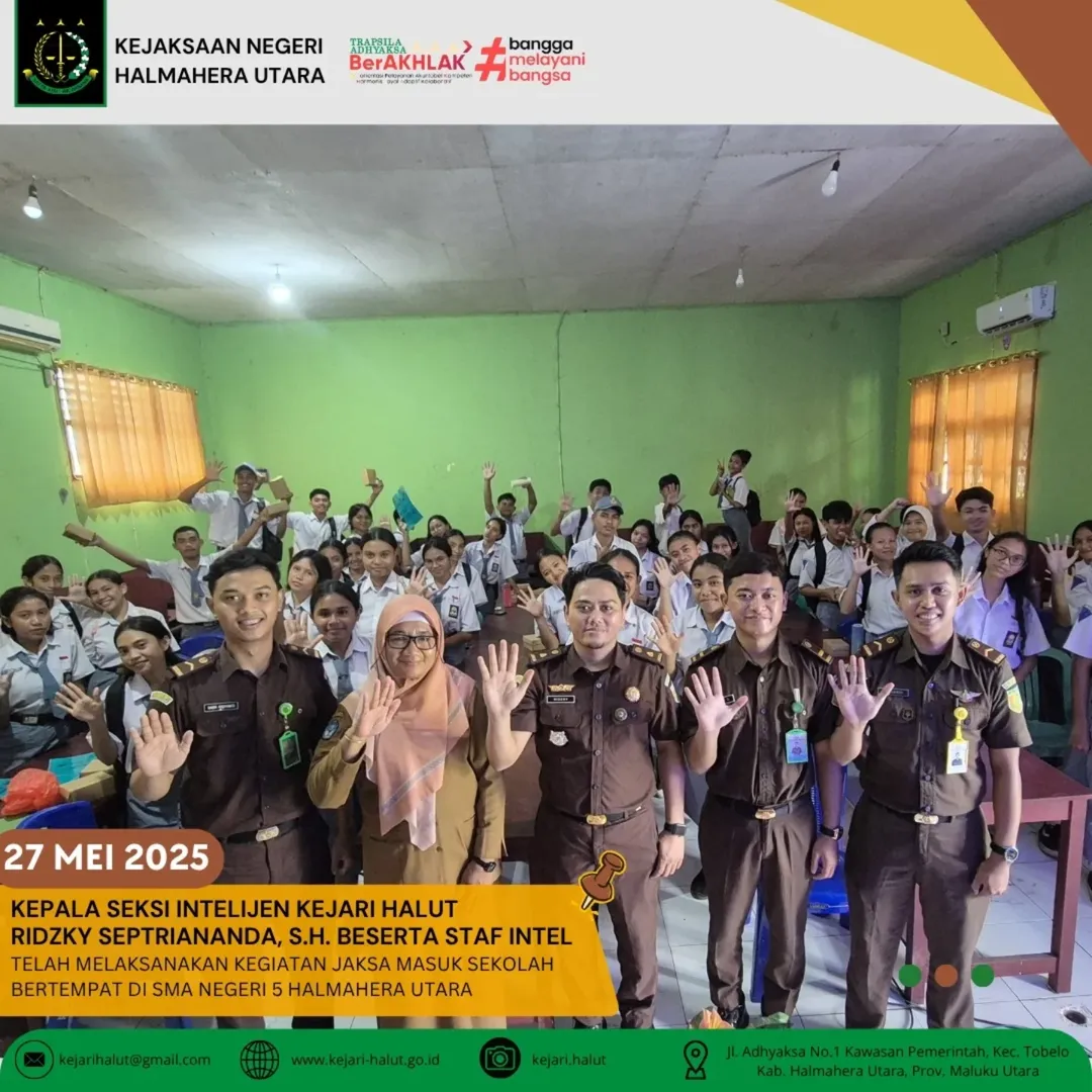 Pada hari Selasa 27 Mei 2025 Bidang Intelijen Kejaksaan Negeri Halmahera Utara telah melaksanakan Kegiatan Jaksa Masuk Sekolah (JMS) pada SMAN 5 Halmahera Utara.