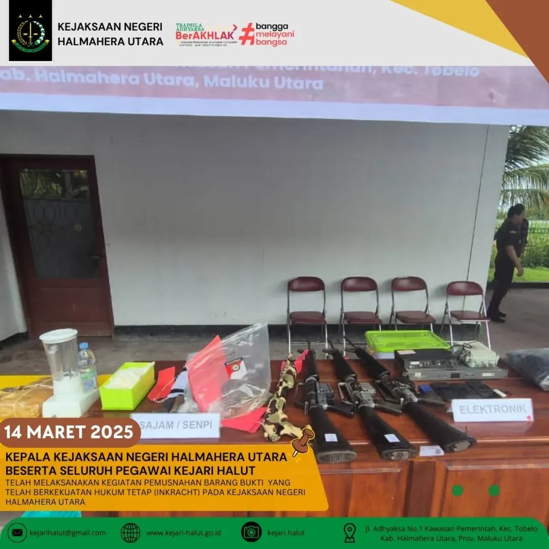 Bertempat di Lapangan Kejaksaan Negeri Halmahera Utara telah dilaksanankan kegiatan Pemusnahan Barang Bukti yang telah berkekekuatan hukum tetap (inkracht) oleh Kepala Kejaksaan Negeri Halmahera Utara Muhammad Ahsan Thamrin S.H., M.H. di ikuti oleh Para Kasi, Kassubagbin, Jaksa Fungsional, beserta seluruh pegawai dan honorer Kejaksaan Negeri Halmahera Utara.